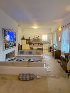 La villa s'étend sur un seul grand étage, les sols sont en ciment avec des inserts en pierre, deux chambres, un grand espace ouvert avec cuisine et une salle de bains .